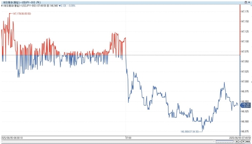 달러-엔 환율은 거래 초반 보합권에서 횡보하다 하락한 뒤 낙폭을 확대해 한때 0.13% 내린 146.880엔을 터치했다.