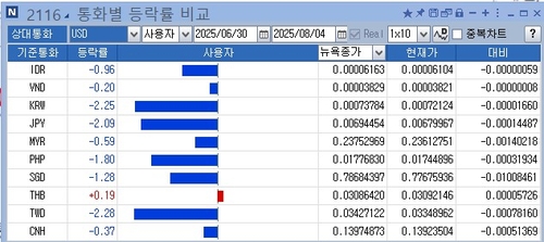 5일 연합인포맥스 통화별 등락률 비교(2116)에 따르면 지난 6월30일 이후 8월 4일까지 원화 약세폭은 2.25%에 달했다.