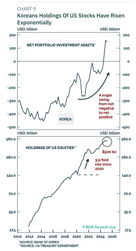 BCA는 "한국 투자자들의 미국 주식 노출도는 지수적으로 증가했다"라며 "만약 미국 주식 시장이 장기적인 하락 국면에 진입한다면, 한국 투자자들은 미국 주식을 구매하는 것을 중단할 위험이 있다"고 말했다.