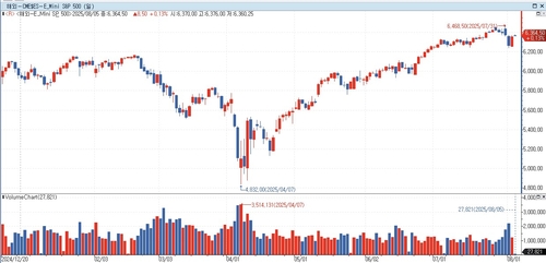 연합인포맥스 지수선물 통합화면(화면번호 6520)에 따르면 한국 시각으로 오전 11시1분 기준 E-미니 S&P500 지수 선물은 전장 대비 0.13% 오른 6,364.50에 거래됐다.
