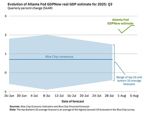 애틀랜타 연은은 이날 앞서 발표된 나온 지난 6월 무역수지 및 공급관리협회(ISM)의 7월 서비스업 구매관리자지수(PMI) 등을 반영한 결과, 실질 개인소비지출(PCE) 증가율이 종전 1.6%에서 2.0%로 높아졌다고 설명했다.