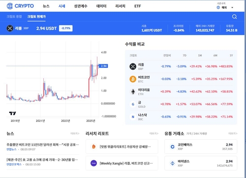 연합인포맥스 크립토 종합화면(2550)에 따르면, 오후 3시19분 현재 코인베이스에서 리플은 2.93달러에 거래되고 있다.