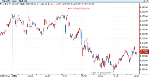 민경원 우리은행 연구원은 '8월 월간 전망'에서 하반기 환율이 1,400원을 회복할 것으로 예상했다. 역내 달러 실수요 점증에 환율 상승 압력이 커질 것으로 보고, 이달 환율 전망치를 1,360원~1,410원으로 제시했다.