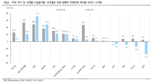 미국 수입 증가율은 수입 국가별로 뚜렷한 온도차를 보였다. 박 연구원은 "1분기와 2분기 모두 견조한 수입 증가세가 유지된 국가 혹은 지역은 대만, 베트남, 인도, 아세안"이라며 "반대로 1분기 대비 수입 증가율이 급격히 둔화된 국가로는 독일, 유럽연합, 캐나다"라고 말했다.