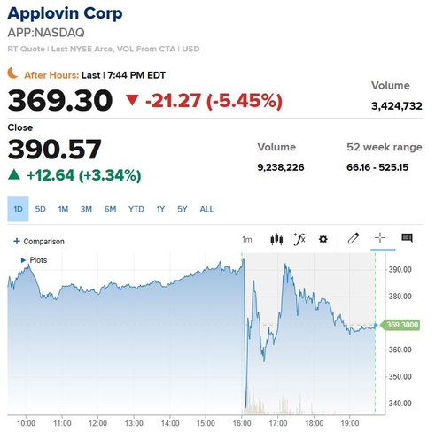 애플로빈은 시간외거래에서 정규장 대비 21.27달러(5.45%) 내린 369.30달러에 거래됐다.
