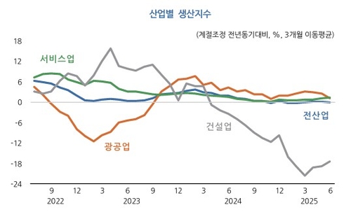 6월 전산업 생산은 건설업 중심으로 낮은 증가율(0.8%)을 기록했다.