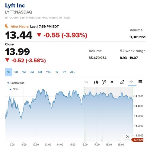 리프트는 시간 외 거래에서 주가가 3.9% 하락한 13.44달러에 거래됐다.