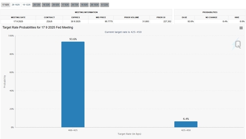시카고상품거래소(CME) 페드워치툴에 따르면 9월에 25bp 금리 인하 가능성은 현재 93%, 10월 연속 금리 인하 가능성은 65%로 반영돼 있다.
