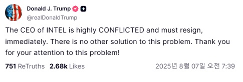 (뉴욕=연합인포맥스) 최진우 특파원 = 도널드 트럼프 미국 대통령은 7일(현지시간) "인텔(NAS:INTC)의 최고경영자(CEO)는 심각한 이행 충돌 상태에 있다"면서 "즉각 사임해야 한다"고 했다.