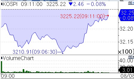 8일 연합인포맥스 신주식종합(화면번호 3536)에 따르면 오전 9시 11분 기준으로 코스피가 전 거래일보다 2.46포인트(0.08%) 하락한 3225.22를 나타냈다.