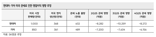 도요타의 관세 영향은 회계연도 기준 내년 1분기 4천500억 엔, 연간으론 1조4천억 엔으로 전망했다. 반면 SK증권은 올해 3분기와 4분기 현대차에 관세로 인한 영업이익 영향을 각각 1조 원과 8천272억 원 발생할 것으로 예상했다.