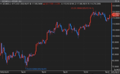 8일 연합인포맥스(화면번호 2520)에 따르면 비트코인 가격은 오전 7시 53분 현재 24시간 전보다 2.27% 급등한 117,641달러에 거래되고 있다.