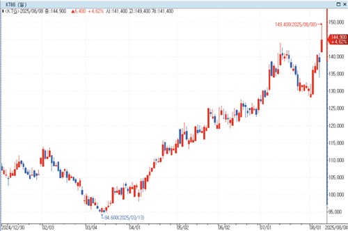 샌즈 카지노 사이트G 주가는 현재 고공행진 중이다. 이날 장중 14만9천400원에 닿으며 장중 기준 고점을 경신했다.