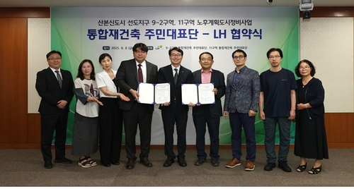 (서울=연합인포맥스) 윤영숙 기자 = 한국토지주택공사(LH)는 LH 경기남부지역본부에서 군포산본 선도지구 2곳(통합9-2구역, 통합11구역) 주민대표단과 업무협약을 체결했다고 8일 밝혔다.