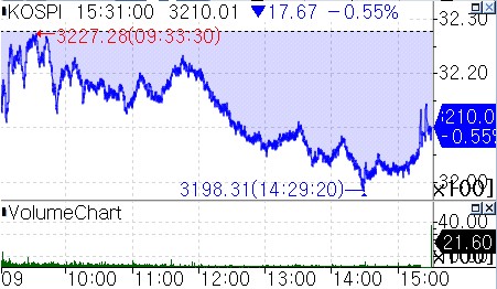 8일 연합인포맥스 신주식종합(화면번호 3536)에 따르면 코스피가 전 거래일보다 17.67포인트(0.55%) 내린 3,210.01로 장을 끝냈다. 코스피는 장 초반 소폭 하락하다가 오후 들어 낙폭을 키웠다. 오후 장중 3,200선을 밑돌았으나 레벨을 지켜내며 일주일을 마감했다. 개인이 순매수했으나 외국인과 기관이 순매도했다.
