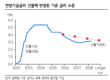 그러면서 "현재 미 국채 선물시장에 반영된 9월 인하 확률은 93%에 달한다"라며 "연말까지 총 2.4회 인하를 예상하는 등 당사의 기본 전망과 크게 다르지 않다"고 덧붙였다.