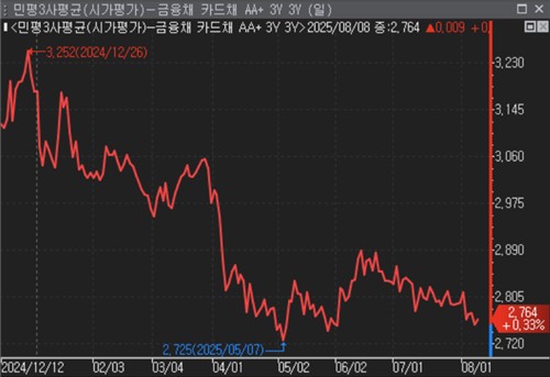 7월 라이브카지노 AA+ 등급 3년물의 민평금리 평균은 2.810%로 전년 동기(3.432%) 대비 0.622%포인트(p) 내렸다.