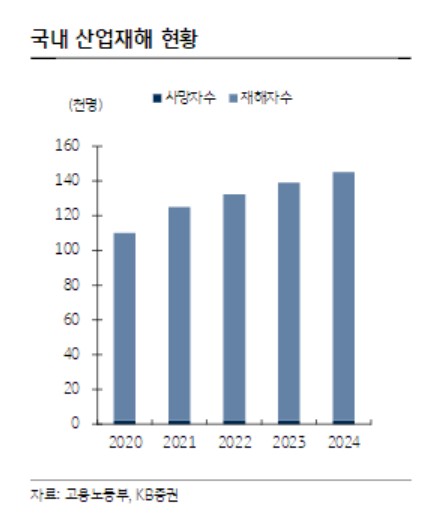 11일 KB증권에 따르면 2024년 국내 산업재해 사망자 수는 589명, 인구 10만 명당 사망률은 4.2명으로 OECD 평균(1.5명)의 약 3배에 달했다.