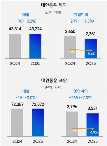 CJ대한통운[000120]을 제외한 매출은 4조3천224억 원, 영업이익은 2천351억 원으로 각각 전년 동기 대비 0.2%, 11.3% 하락했다.