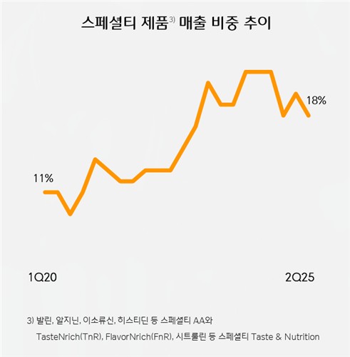특히 스페셜티 제품 중 하나인 사료용 하스티딘은 연어 사료 시장의 지속적인 수요 증가에 생산을 늘리고 글로벌 점유율을 확대하며 성장률 88%를 달성했다.