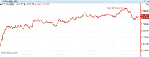 이날 국내 증시는 상승 출발했다. 개장 후 상승 폭을 1% 넘게 확대하면서 3,240대로 레벨을 높였다.