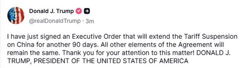 (서울=연합인포맥스) 홍경표 기자 = 도널드 트럼프 미국 대통령은 11일(현지시간) "방금 중국에 대한 관세 유예를 90일 더 연장하는 행정명령에 서명했다"고 말했다.