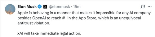 머스크 CEO는 "xAI는 즉각적으로 법적 조치를 취할 것이다"고 덧붙였다.
