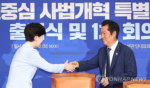 그러면서 "가장 중요한 건 개혁의 골든타임"이라며 "시기를 놓치면 내용도 방향도 잃을 수 있다. 우리가 목표한 추석 전에 사법개혁을 완료한다는 역사적 사명감을 가지고 위원님들께서 임해달라"고 당부했다.