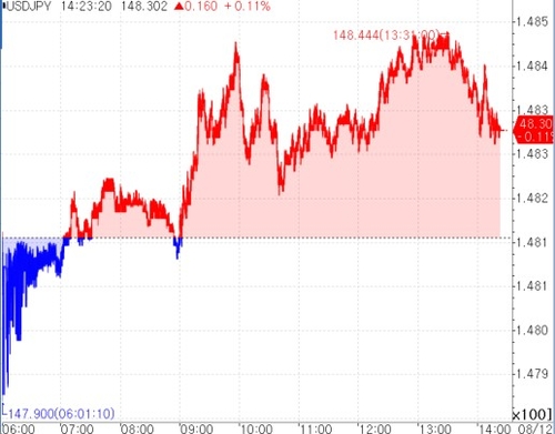 연합인포맥스 해외 주요국 외환 시세(6411)에 따르면 오후 2시 23분 현재 달러-엔 환율은 전장 대비 0.11% 오른 148.302엔에 거래됐다.