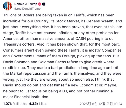 트럼프 대통령은 "그런데도 데이비드 솔로몬(골드만삭스 최고경영자)과 골드만삭스는 정작 공로를 인정하지 않고 있다"면서 "그들은 시장 영향과 관세에 대해 오래전 잘못된 예측을 했고, 그 밖에 많은 부분처럼 이번에도 틀렸다"고 비판했다.