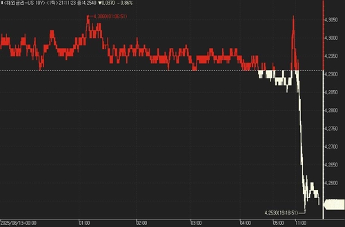 연합인포맥스의 해외금리 일중 화면(화면번호 6532)에 따르면 13일(미국 동부시간) 오전 8시 현재 뉴욕 채권시장에서 10년물 국채금리는 전 거래일 오후 3시 기준가보다 3.40bp 밀린 4.259%를 기록했다.