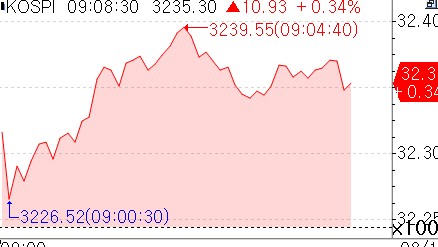 14일 연합인포맥스 신주식종합(화면번호 3536)에 따르면 오전 9시 3분 현재 코스피는 전일보다 10.74포인트(0.33%) 상승한 3,235.11을 기록했다.