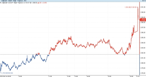 14일 외환시장에 따르면 달러-원 환율은 오후 9시 34분 현재 전장대비 7.80원 급등한 1,389.50원에 거래됐다.