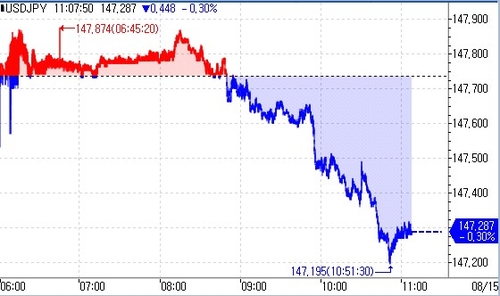 오전 11시 7분 현재 달러-엔은 전장보다 0.30% 하락한 147.287엔에 거래됐다.