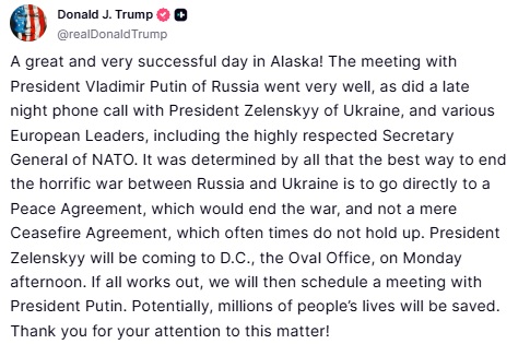 트럼프 대통령은 "알래스카주(州)에서 정말 위대하고 매우 성공적인 하루를 보냈다"면서 "러시아의 블라디미르 푸틴 대통령과 회담은 아주 잘 진행됐고, 젤렌스키 대통령 및 북대서양조약기구(나토) 사무총장을 포함한 여러 유럽 지도자와 늦은 밤 전화 통화도 성공적이었다"고 평가했다.