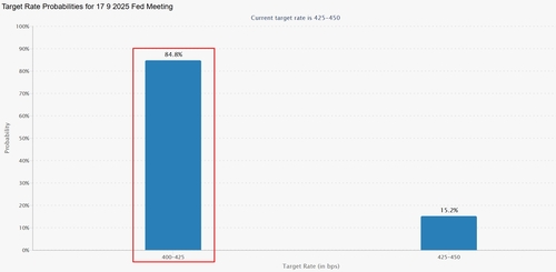 시카고상품거래소(CME) 페드워치에 따르면, 연방기금금리(FFR) 선물시장에 반영된 9월 금리 인하 가능성은 80% 중반대를 나타냈다. 전주대비 다소 낮아졌다.