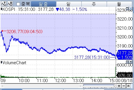 18일 연합인포맥스 신주식종합(화면번호 3536)에 따르면 코스피는 전 거래일보다 48.38포인트(1.50%) 하락한 3,177.28에서 거래를 마쳤다.