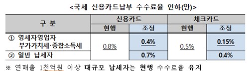 국세청이 공개한 인하안에 따르면 일반 납세자의 국세 신용카드 납부 수수료율은 현행 0.8%에서 0.7%로 조정된다. 체크카드의 경우 수수료율이 0.5%에서 0.4%로 낮아진다.