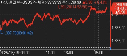 19일 서울외환시장에서 달러-원 환율은 오후 3시 30분 기준으로 전장 대비 5.90원 상승한 1,390.90원에 정규장 거래를 마쳤다.