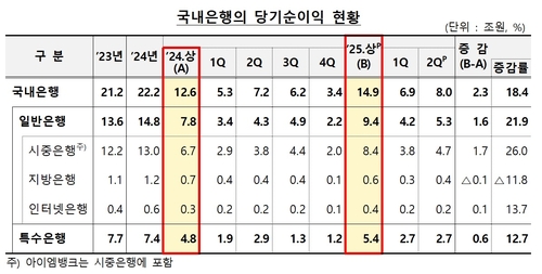 21일 금융감독원이 발표한 '2025년 상반기 국내은행 영업실적(잠정)'에 따르면 올해 상반기 국내은행의 당기순이익은 14조9천억원으로 전년 동기(12조6천억원) 대비 18.4%(2조3천억원) 증가했다.