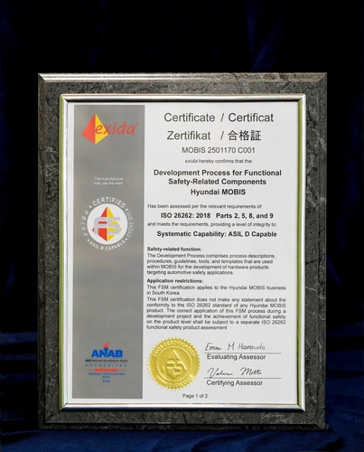 (서울=연합인포맥스) 이재헌 기자 = 현대모비스[012330]의 차량용 반도체 연구개발 프로세스가 기능안전 국제표준인 'ISO 26262' 인증을 최고 등급으로 획득했다고 21일 밝혔다. 세계적 권위의 자동차 기능안전 및 사이버보안 전문 심사기관인 독일 엑시다(Exida)로부터 취득했다.