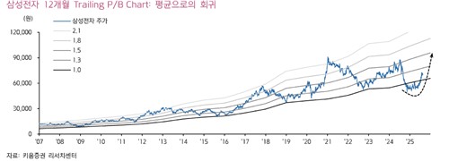 박 연구원은 "삼성전자의 주가는 HBM과 파운드리의 경쟁력 회복이 예상됨에도 불구하고, 지난 2000년 이후 평균밸류에이션(T12M P/B 1.5배) 미만인 1.2배 수준에서 거래되고 있다"고 말했다.