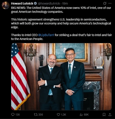러트닉 장관은 이날 자신의 엑스(X·옛 트위터) 계정에 "미국이 이제 우리 훌륭한 미국 기술 기업 중 하나인 인텔의 10%를 보유하게 됐다"고 적었다.