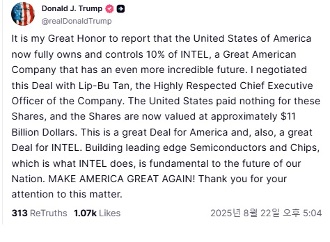 도널드 트럼프 미국 대통령은 22일(현지시간) 자신의 소셜 미디어인 트루스 소셜에 "미국이 훌륭한 미국 기업인 인텔의 (지분) 10%를 완전히 소유하고 통제하게 됐음을 보고하게 돼 큰 영광이다"고 적었다.
