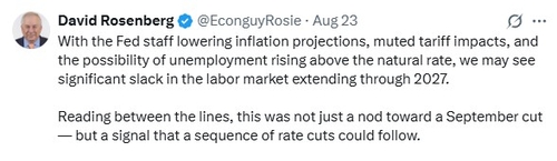 로젠버그는 23일(현지시간) 파월 의장의 잭슨홀 회의 연설 이후 자신의 'X(구 트위터)' 계정을 통해 "연준 직원들이 인플레이션 전망을 하향 조정하고, 관세의 영향이 미미하며, 실업률이 자연실업률을 웃돌 가능성이 제기되는 상황에서 2027년까지 고용시장에 상당한 슬랙(유휴 자원)이 지속할 가능성이 있다"며 이같이 말했다.