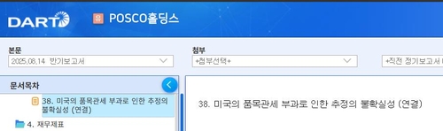 관세 직격탄을 맞은 자동차 업계에서도 이런 양상이 감지됐다. 포스코퓨처엠[003670]도 별도 목차를 두고 자동차·부품에 25% 품목 관세가 매겨졌다면서, 미국에 판매하고 있는 전기차 배터리 소재 양극재·음극재의 매출이 전체의 32%에 해당한다고 구체적으로 밝혔다.