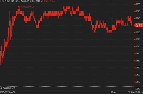 연합인포맥스의 해외금리 일중 화면(화면번호 6532)에 따르면 25일(미국 동부시간) 오전 9시 현재 뉴욕 채권시장에서 10년물 국채금리는 전 거래일 오후 3시 기준가보다 1.90bp 오른 4.278%를 기록했다.