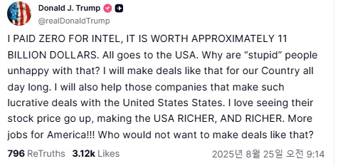 트럼프 대통령은 이날 자신의 소셜 미디어인 트루스 소셜에 "나는 인텔(지분)에 대해 한 푼도 지불하지 않았다"면서 "그것은 대략 110억달러의 가치가 있다"고 적었다.
