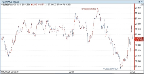 연합인포맥스(화면번호 6411)에 따르면 25일 오전 10시께(이하 미 동부시간) 뉴욕 외환시장에서 주요 6개 통화에 대한 달러 가치를 반영하는 달러인덱스(DXY)는 97.878로 전장 마감 가격(97.743)보다 0.135포인트(0.138%) 상승했다.
