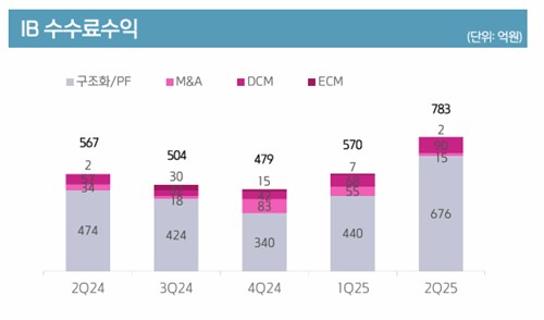 키움에 따르면 지난 2분기 IB수수료수익은 783억 원으로, 전분기(570억 원) 대비 213억 원(37.3%) 증가했다. 이 중에서 구조화 및 PF 부문 수익은 676억 원을 기록하면서 전체 IB수수료 가운데 86%를 차지했다.